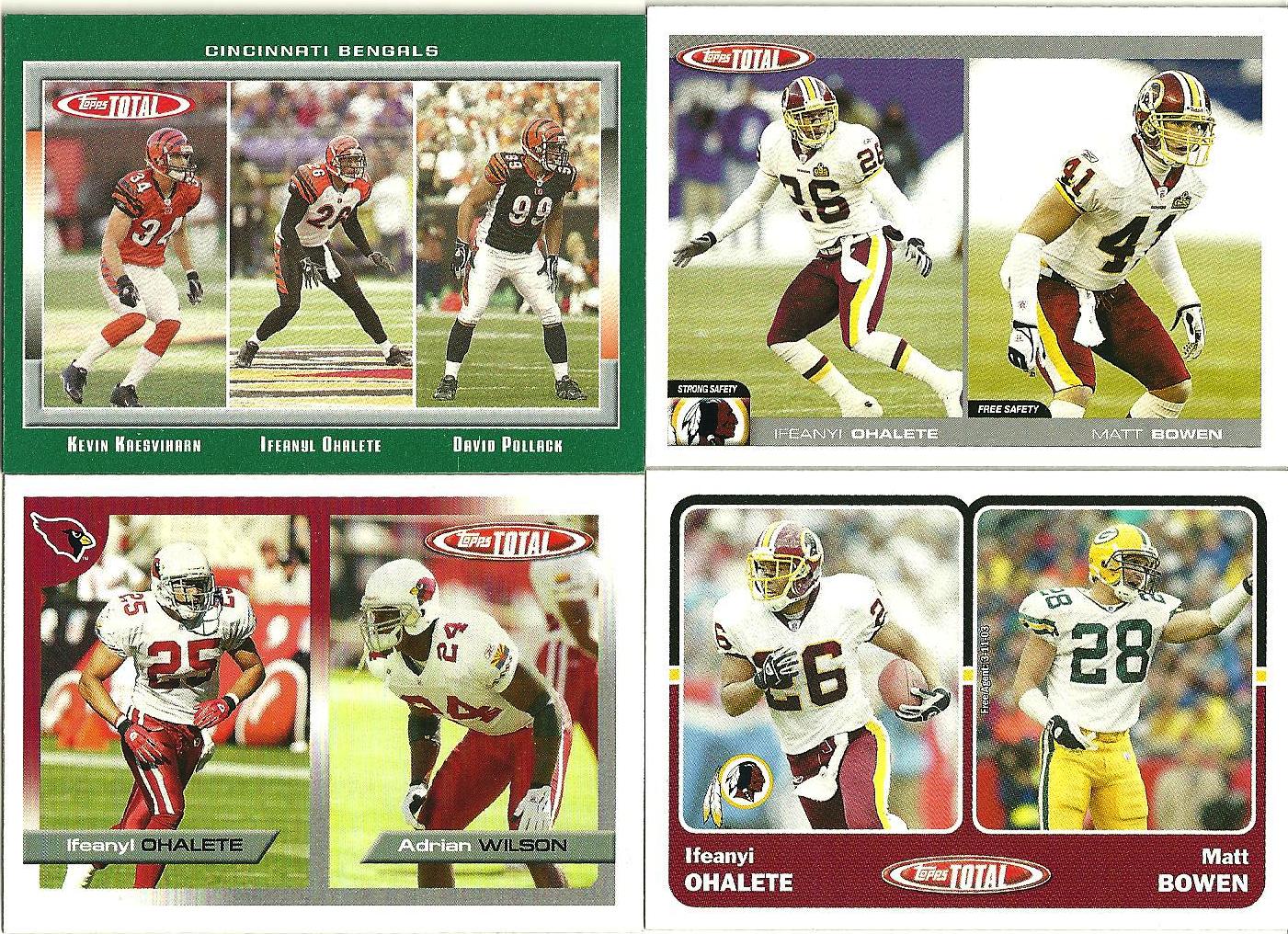 The back of Ohalete's '04 Total card is pretty optimistic, showing his 103 tackles and mentioning how he is "a rising star among NFL Strong Safeties." What the card back fails to mention, however, is that many of his other numbers dropped from his 2002 season, and that the 2004 offseason brought lots of drama to Ohalete's life. Clinton Portis was traded to Washington during the 03-04 offseason, and he really wanted Ohalete's #26. They worked out a deal, but Ohalete said that Portis forced payment and it all got pretty awkward. In the end it was all for naught, as the Redskins cut Ohalete and gave his job to a combination of Ryan Clark and Bowen. Ohalete moved on to the Arizona Cardinals.2005 Topps Total #8 w/ Adrian Wilson: