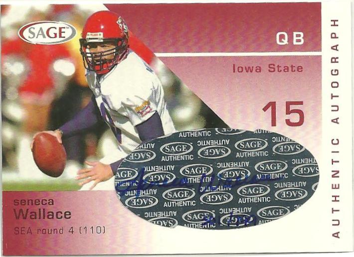 I LOVE serial numbered cards. So this automatically ruled anyways due to it's serial-ness. However, this is also my very first Sweet Spot "on ball" auto, and I have to say that these babies are intimidating in person. I didn't realize that the ball was actually a ball, and man does it look fantastic! Easily one of the coolest autographs I now have!Speaking of autographs, I picked up a few Seneca Wallace autos recently. I'm trying to get every color auto of his from 2003 Sage. So far I have